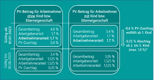 Der Beitragssatz wird zum 01.07.2023 um 0,35 % angehoben. Bei der Beitragshöhe muss künftig die Zahl der Kinder berücksichtigt werden. Der Kinderlosenzuschlag wird auf 0,6 Beitragssatzpunkte angehoben. Zugleich werden Beitragszahler ab dem zweiten bis zum fünften Kind entlastet – mit einem Abschlag in Höhe von 0,25 Beitragssatzpunkten für jedes Kind bis zur Vollendung des 25. Lebensjahres